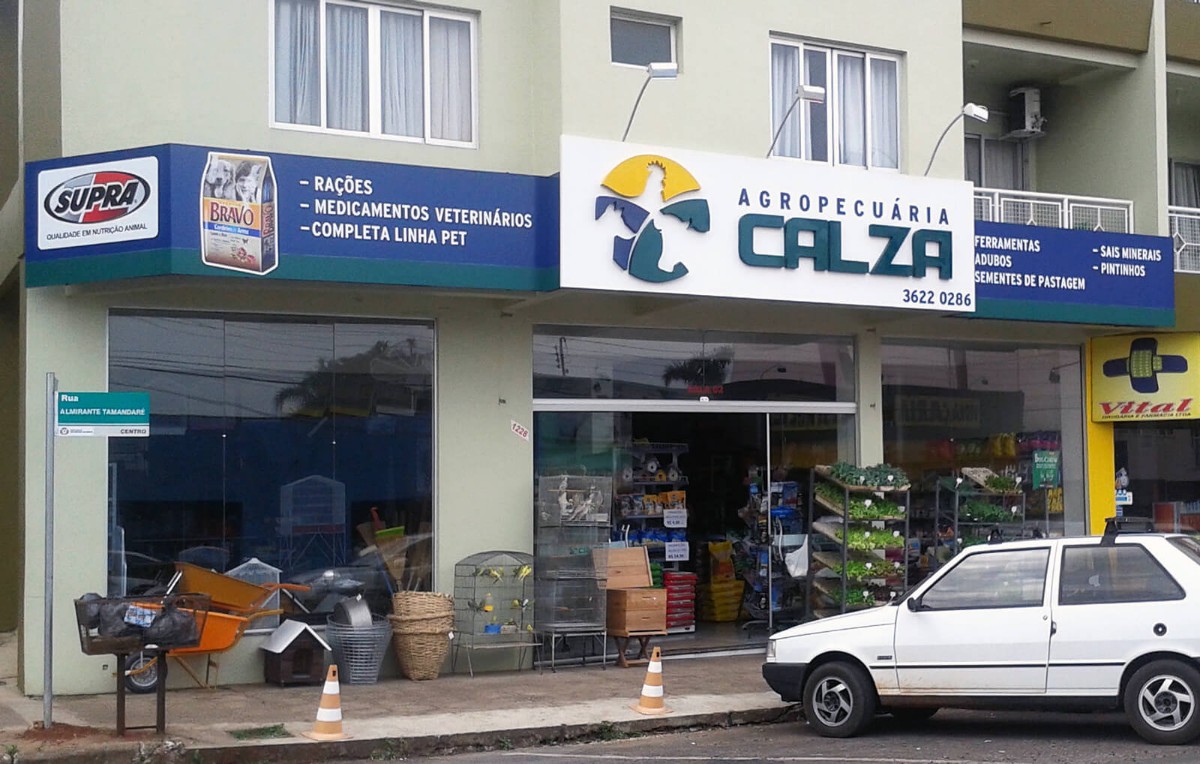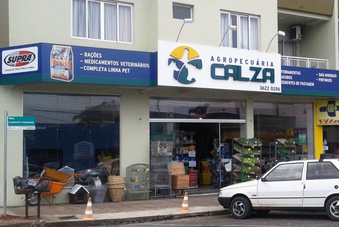 Cliente: Agropecuária CalzaCidade: São Miguel do Oeste/SCDetalhes: Fachada em ACM com letreiro em caixa alta de metal + Recortes em ACM e adesivos