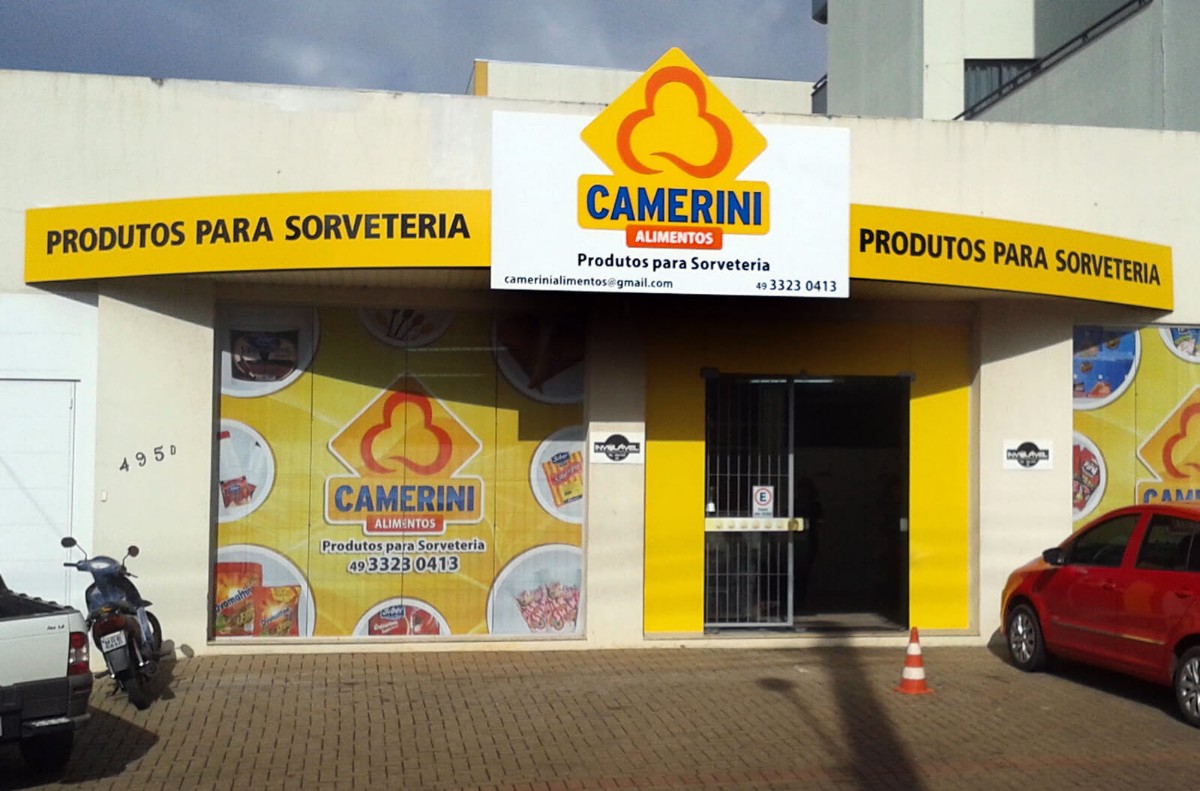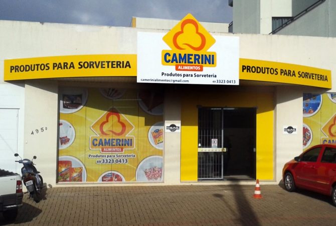 Cliente: Camerini AlimentosCidade: Chapecó/SCDetalhes: Fachada em ACM com portal e plotagem de vidraça