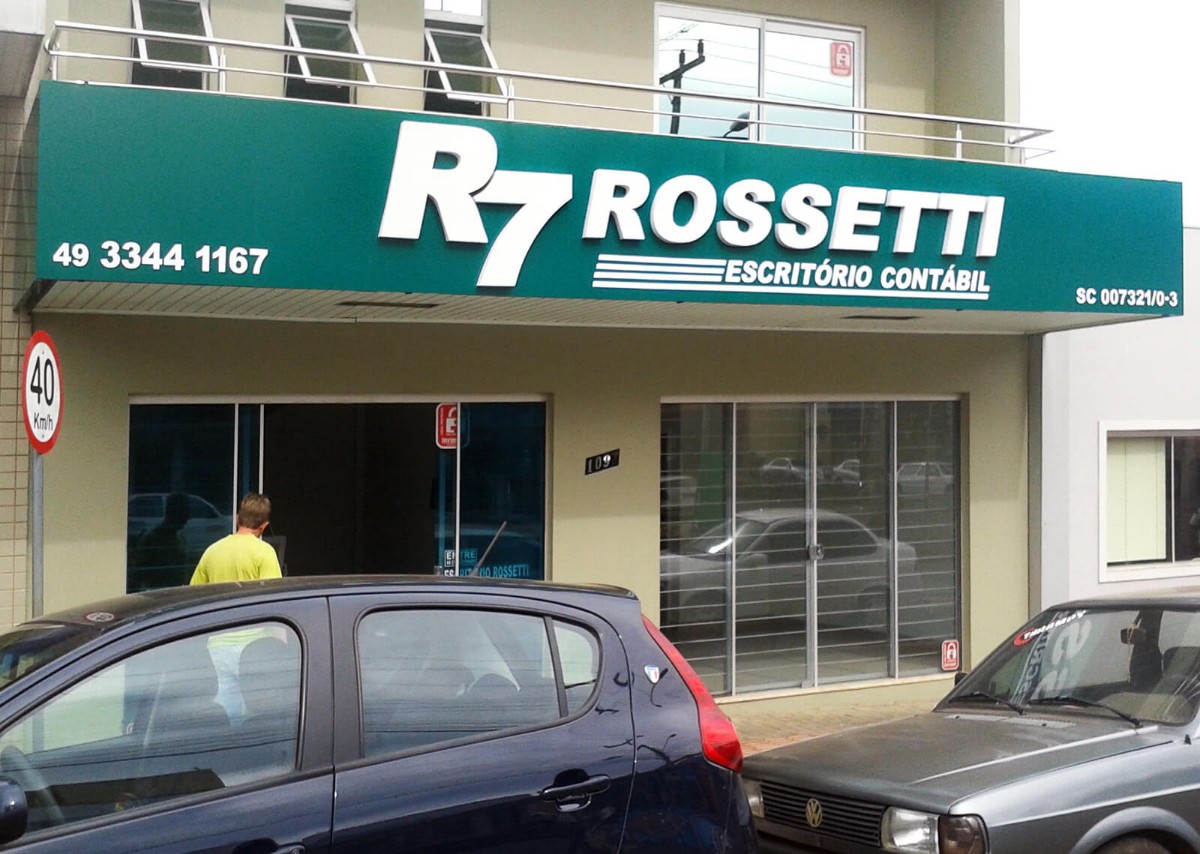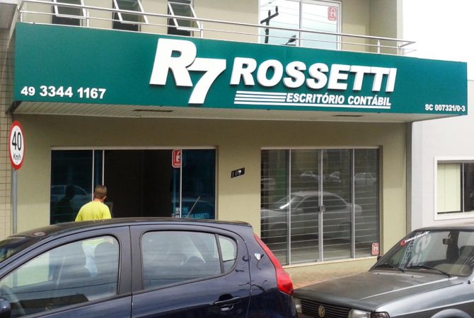 Cliente: Rossetti Escritório ContábilCidade: São Lourenço do Oeste/SCDetalhes: Fachada em ACM com letreiro em caixa alta de metal + recortes de ACM